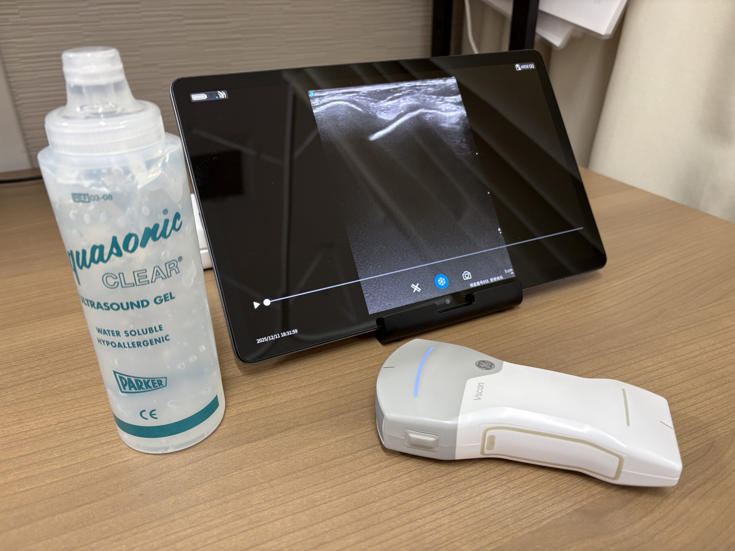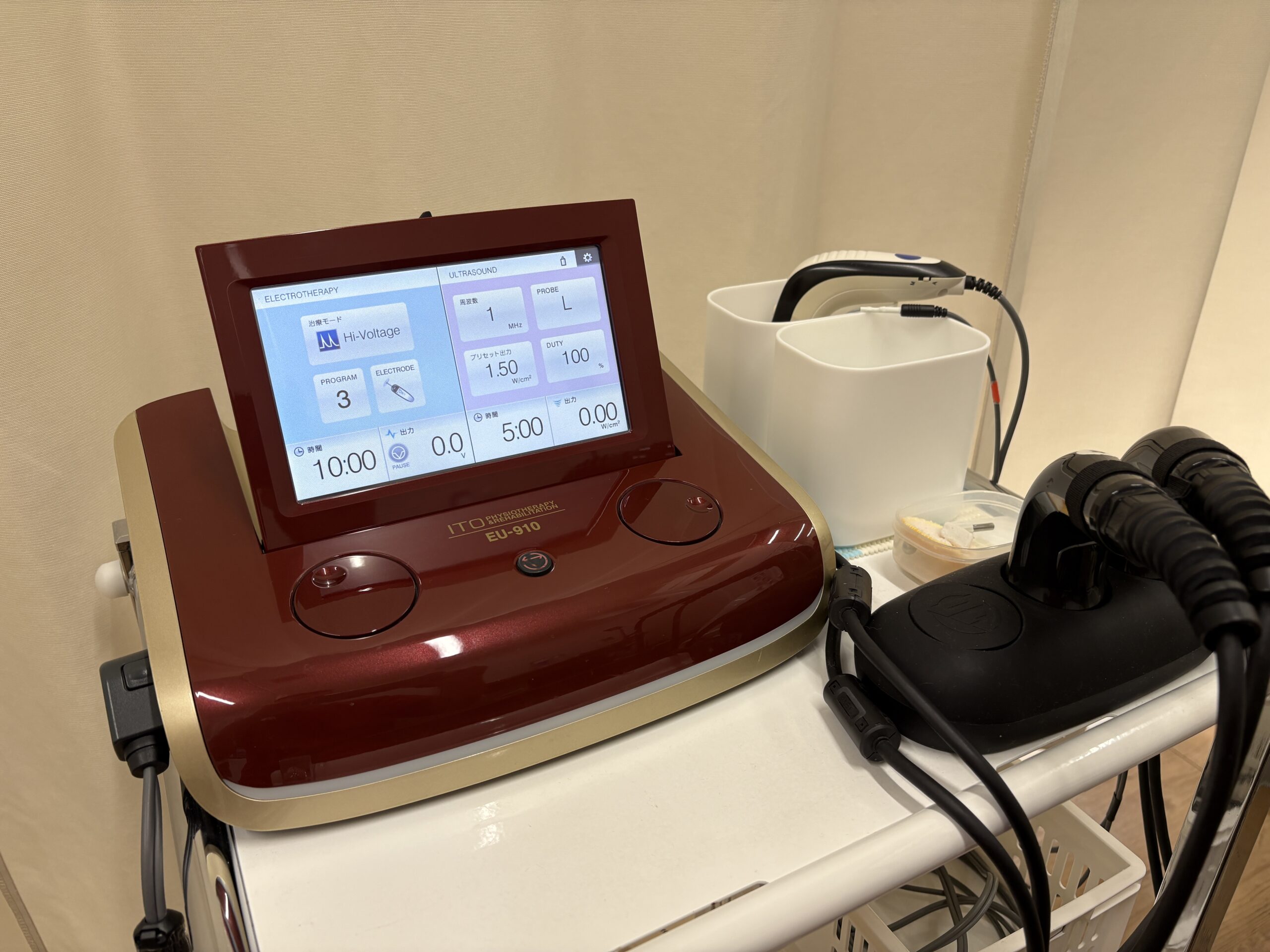 超音波観察装置で痛んだ組織を確認します。触診のみでは確認することの出来ない体のなかを観察し、痛い方と痛くないを比べてどうなっているのか分かりやすく説明します。